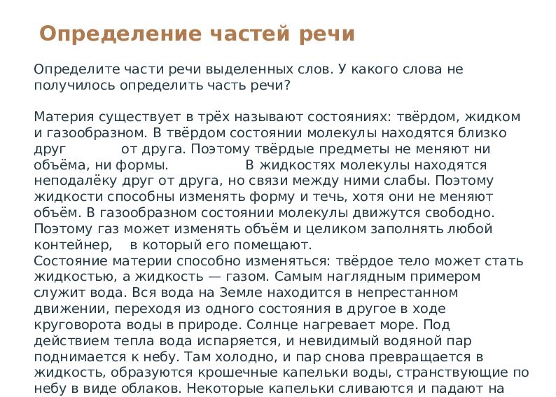 Слайд 7: Определение частей речи Определите части речи выделенных слов. У какого слова не получилось определить часть речи? Материя существует в трёх называют состояниях: твёрдом, жидком и газообразном. В твёрдом состоянии молекулы находятся близко друг от друга. Поэтому твёрдые предметы не меняют ни объёма, ни формы. В жидкостях молекулы находятся неподалёку друг от друга, но связи между ними слабы. Поэтому жидкости способны изменять форму и течь, хотя они не меняют объём. В газообразном состоянии молекулы движутся свободно. Поэтому газ может изменять объём и целиком заполнять любой контейнер, в который его помещают. Состояние материи способно изменяться: твёрдое тело может стать жидкостью, а жидкость — газом. Самым наглядным примером служит вода. Вся вода на Земле находится в непрестанном движении, переходя из одного состояния в другое в ходе круговорота воды в природе. Солнце нагревает море. Под действием тепла вода испаряется, и невидимый водяной пар поднимается к небу. Там холодно, и пар снова превращается в жидкость, образуются крошечные капельки воды, странствующие по небу в виде облаков. Некоторые капельки сливаются и падают на землю в виде дождя