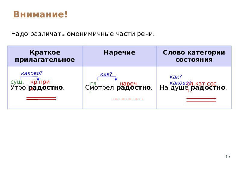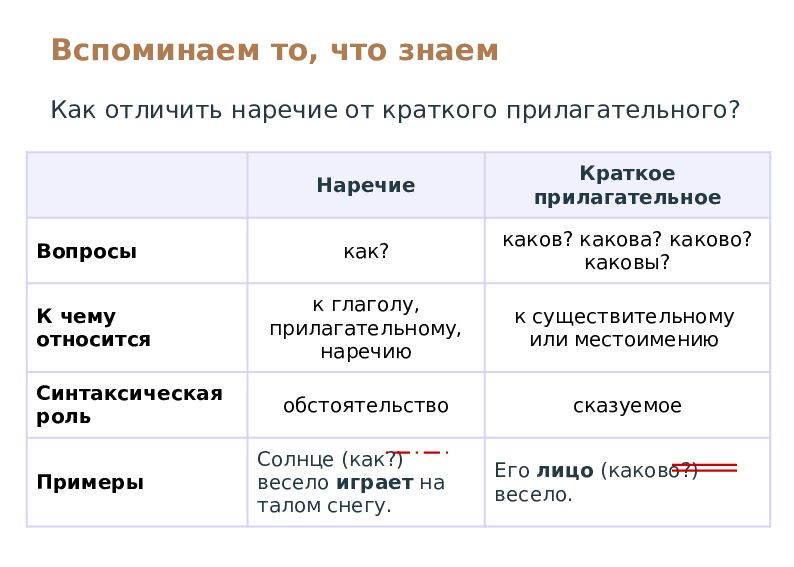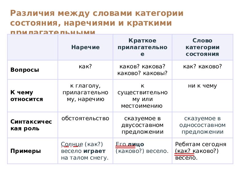 Наречие Краткое прилагательное Слово категории состояния Вопросы как? каков? какова? каково? каковы? как? каково? К чему относится к глаголу, прилагательному, наречию к существительному или местоимению ни к чему Синтаксическая роль обстоятельство сказуемое в двусоставном предложении сказуемое в односоставном предложении Примеры Солнце (как?) весело играет на талом снегу. Его лицо (каково?) весело. Ребятам сегодня (как? каково?) весело.