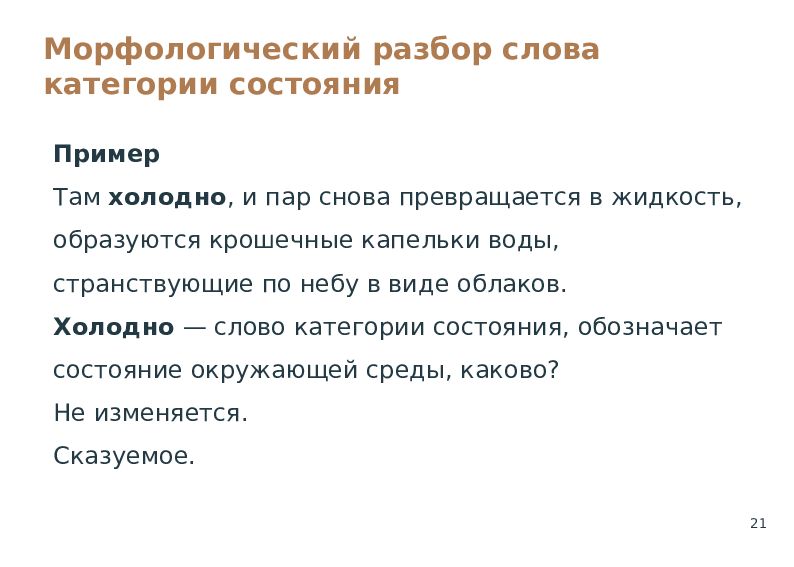 Слайд 21: Пример Там холодно, и пар снова превращается в жидкость, образуются крошечные капельки воды, странствующие по небу в виде облаков. Холодно — слово категории состояния, обозначает состояние окружающей среды, каково? Не изменяется. Сказуемое. Морфологический разбор слова категории состояния