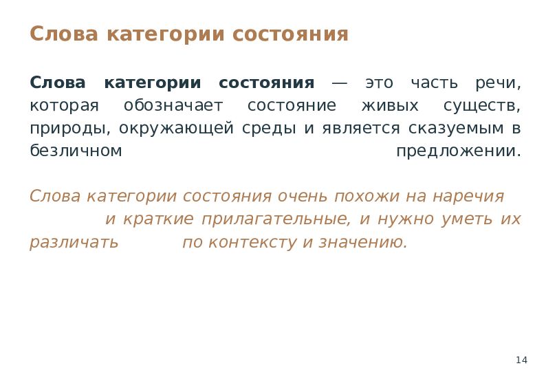 Слайд 14: Слова категории состояния — это часть речи, которая обозначает состояние живых существ, природы, окружающей среды и является сказуемым в безличном предложении. Слова категории состояния очень похожи на наречия и краткие прилагательные, и нужно уметь их различать по контексту и значению. Слова категории состояния
