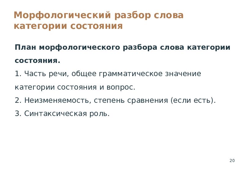Слайд 20: План морфологического разбора слова категории состояния. 1. Часть речи, общее грамматическое значение категории состояния и вопрос. 2. Неизменяемость, степень сравнения (если есть). 3. Синтаксическая роль. Морфологический разбор слова категории состояния