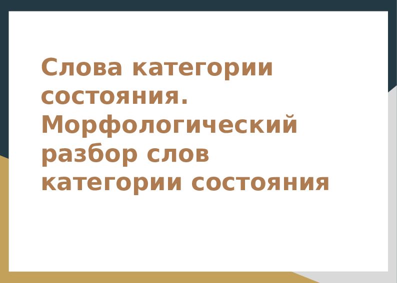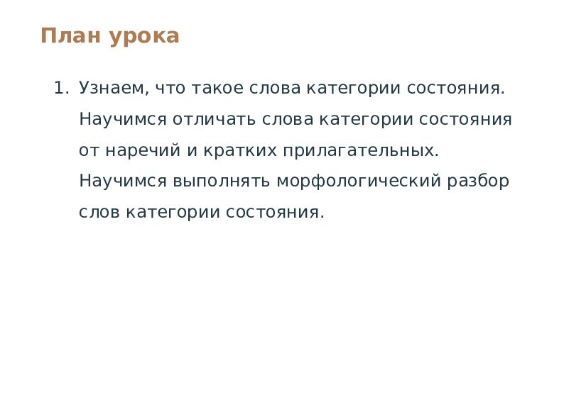 Слайд 13: План урока Узнаем, что такое слова категории состояния. Научимся отличать слова категории состояния от наречий и кратких прилагательных. Научимся выполнять морфологический разбор слов категории состояния
