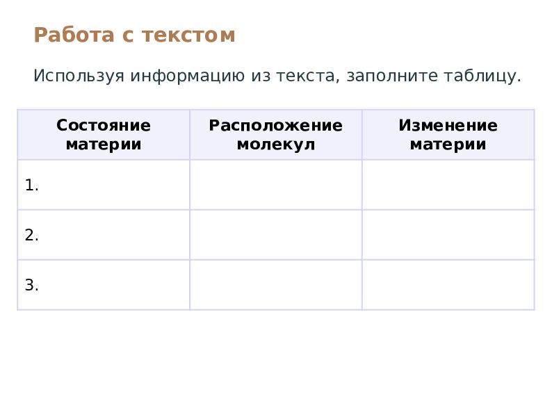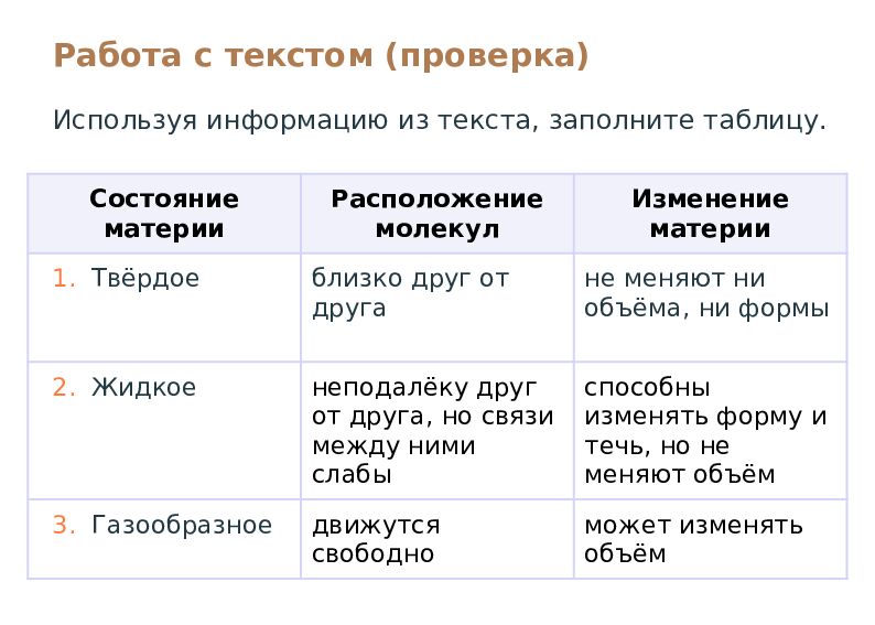 Состояние материи Расположение молекул Изменение материи Твёрдое близко друг от друга не меняют ни объёма, ни формы Жидкое неподалёку друг от друга, но связи между ними слабы способны изменять форму и течь, но не меняют объём Газообразное движутся свободно может изменять объём Используя информацию из текста, заполните таблицу. Работа с текстом (проверка)