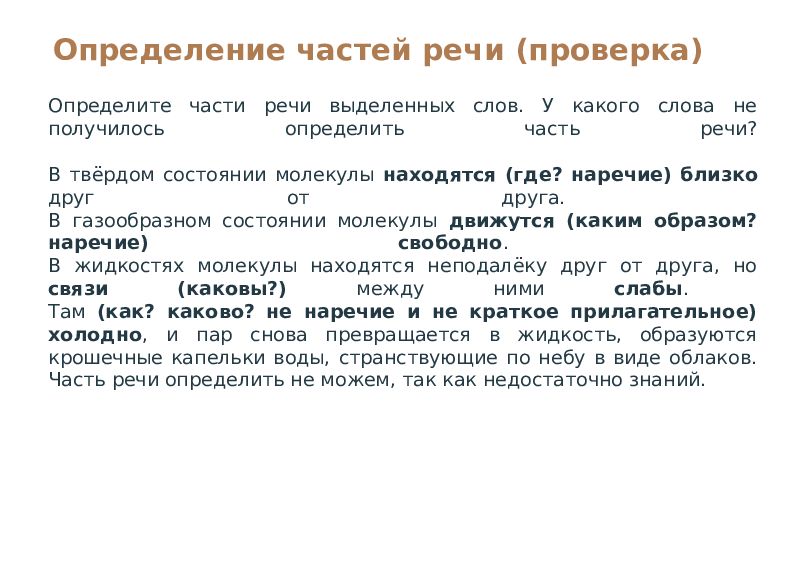 Слайд 8: Определение частей речи (проверка) Определите части речи выделенных слов. У какого слова не получилось определить часть речи? В твёрдом состоянии молекулы находятся (где? наречие) близко друг от друга. В газообразном состоянии молекулы движутся (каким образом? наречие) свободно. В жидкостях молекулы находятся неподалёку друг от друга, но связи (каковы?) между ними слабы. Там (как? каково? не наречие и не краткое прилагательное) холодно, и пар снова превращается в жидкость, образуются крошечные капельки воды, странствующие по небу в виде облаков. Часть речи определить не можем, так как недостаточно знаний