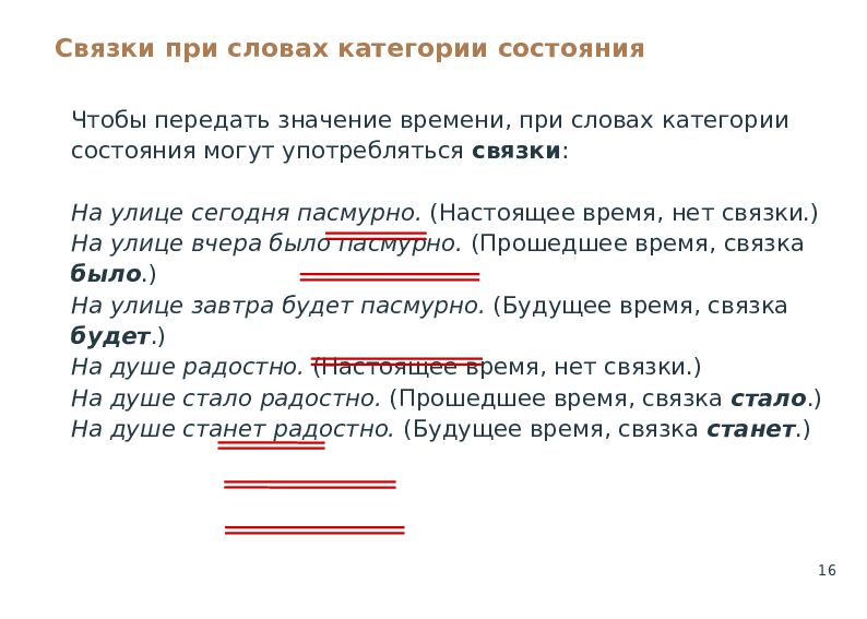 Слайд 16: Чтобы передать значение времени, при словах категории состояния могут употребляться связки : На улице сегодня пасмурно. (Настоящее время, нет связки.) На улице вчера было пасмурно. (Прошедшее время, связка было.) На улице завтра будет пасмурно. (Будущее время, связка будет.) На душе радостно. (Настоящее время, нет связки.) На душе стало радостно. (Прошедшее время, связка стало.) На душе станет радостно. (Будущее время, связка станет.) Связки при словах категории состояния