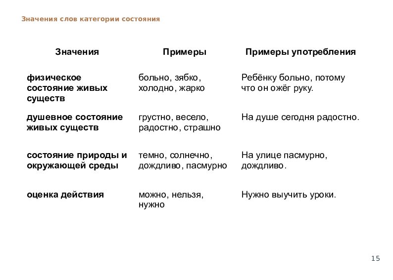 15 Значения Примеры Примеры употребления физическое состояние живых существ больно, зябко, холодно, жарко Ребёнку больно, потому что он ожёг руку. душевное состояние живых существ грустно, весело, радостно, страшно На душе сегодня радостно. состояние природы и окружающей среды темно, солнечно, дождливо, пасмурно На улице пасмурно, дождливо. оценка действия можно, нельзя, нужно Нужно выучить уроки.