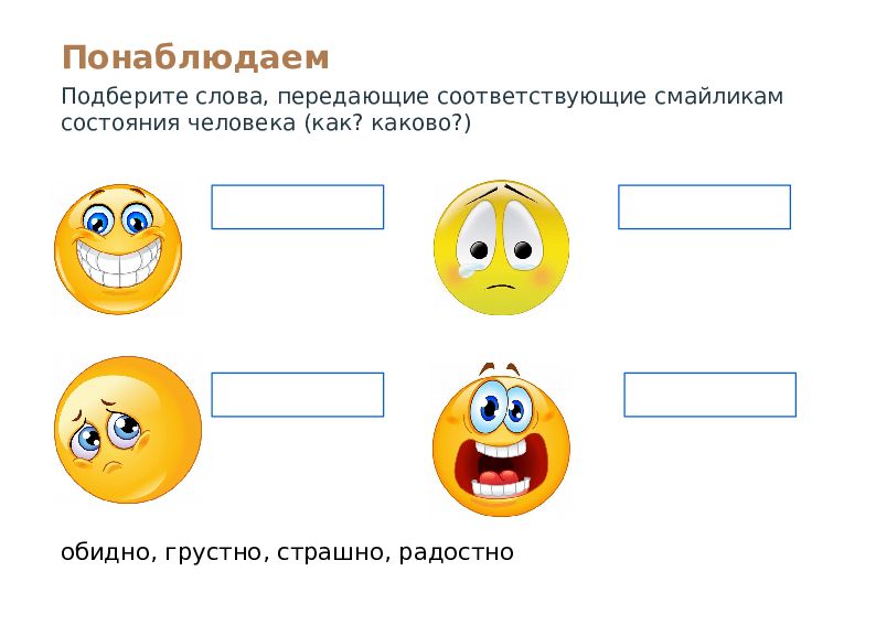 Слайд 11: Подберите слова, передающие соответствующие смайликам состояния человека (как? каково?) Понаблюдаем