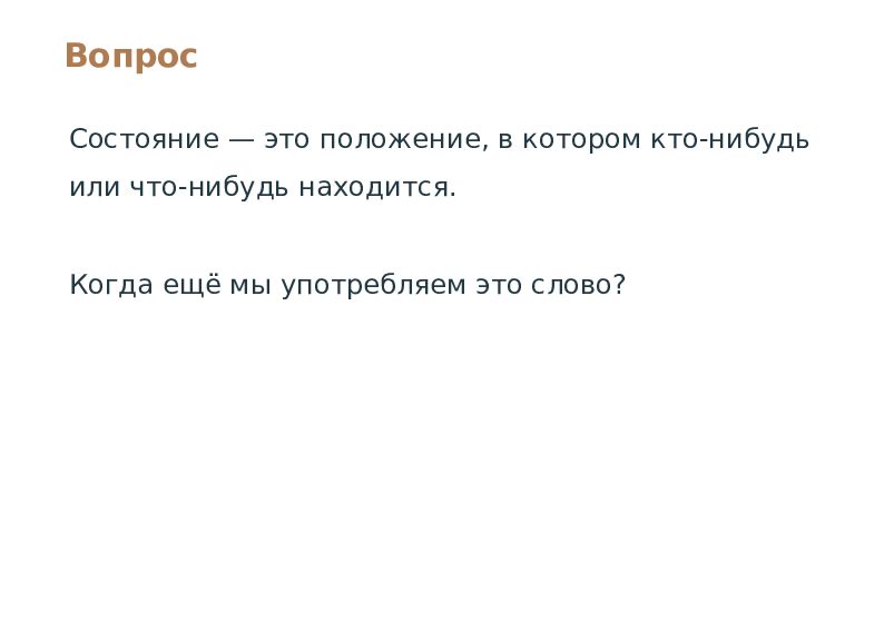 Слайд 9: Состояние — это положение, в котором кто-нибудь или что-нибудь находится. Когда ещё мы употребляем это слово? Вопрос