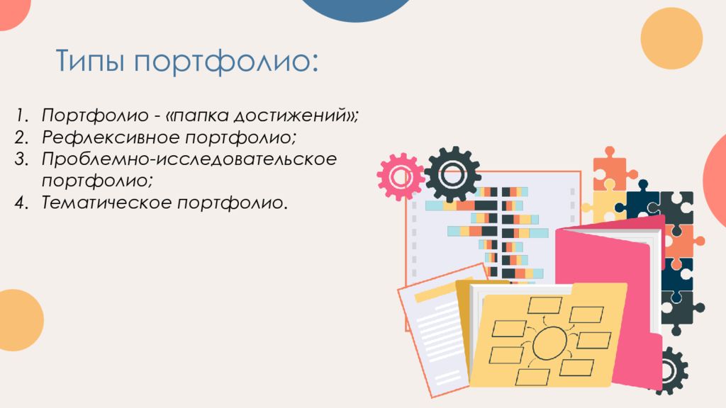 Портфолио - «папка достижений»; Рефлексивное портфолио; Проблемно-исследовательское портфолио; Тематическое портфолио.