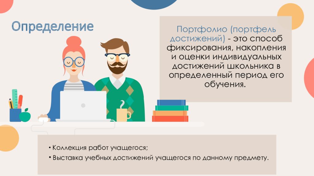 Портфолио (портфель достижений) - это способ фиксирования, накопления и оценки индивидуальных достижений школьника в определенный период его обучения. Коллекция работ учащегося; Выставка учебных достижений учащегося по данному предмету.