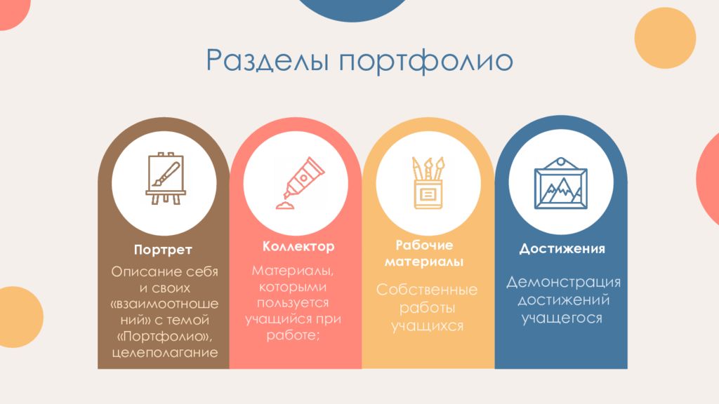 Портрет Описание себя и своих «взаимоотношений» с темой «Портфолио», целеполагание Рабочие материалы Собственные работы учащихся Достижения Материалы, которыми пользуется учащийся при работе; Коллектор Демонстрация достижений учащегося