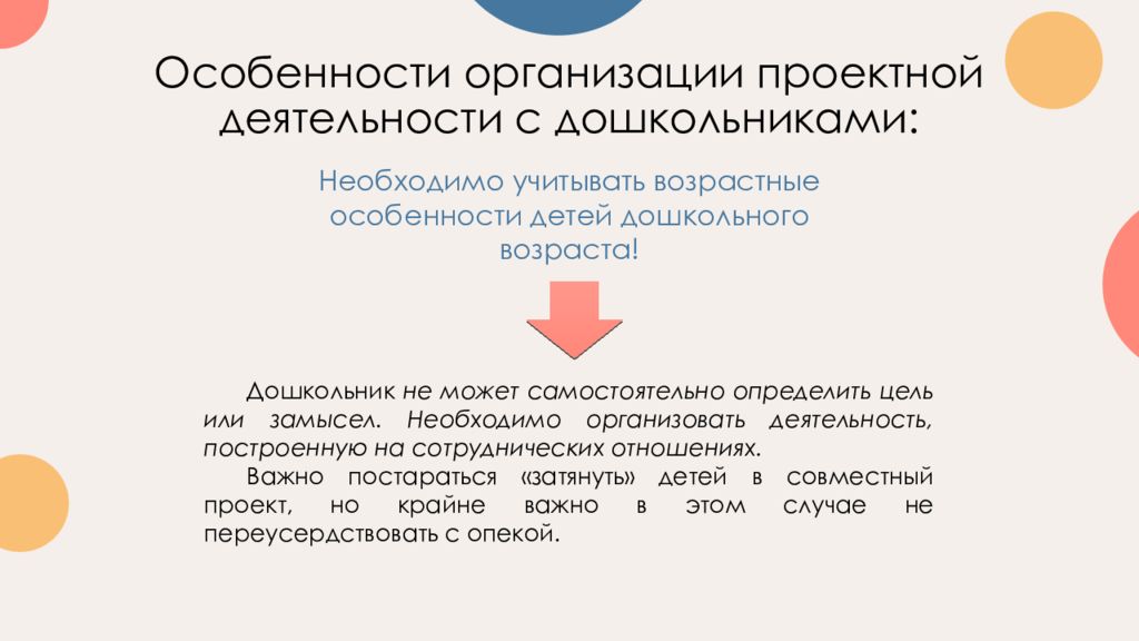 Необходимо учитывать возрастные особенности детей дошкольного возраста! Дошкольник не может самостоятельно определить цель или замысел. Необходимо организовать деятельность, построенную на сотруднических отношениях. Важно постараться «затянуть» детей в совместный проект, но крайне важно в этом случае не переусердствовать с опекой.