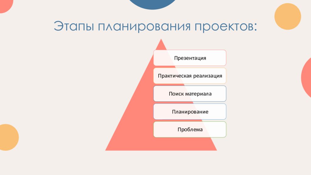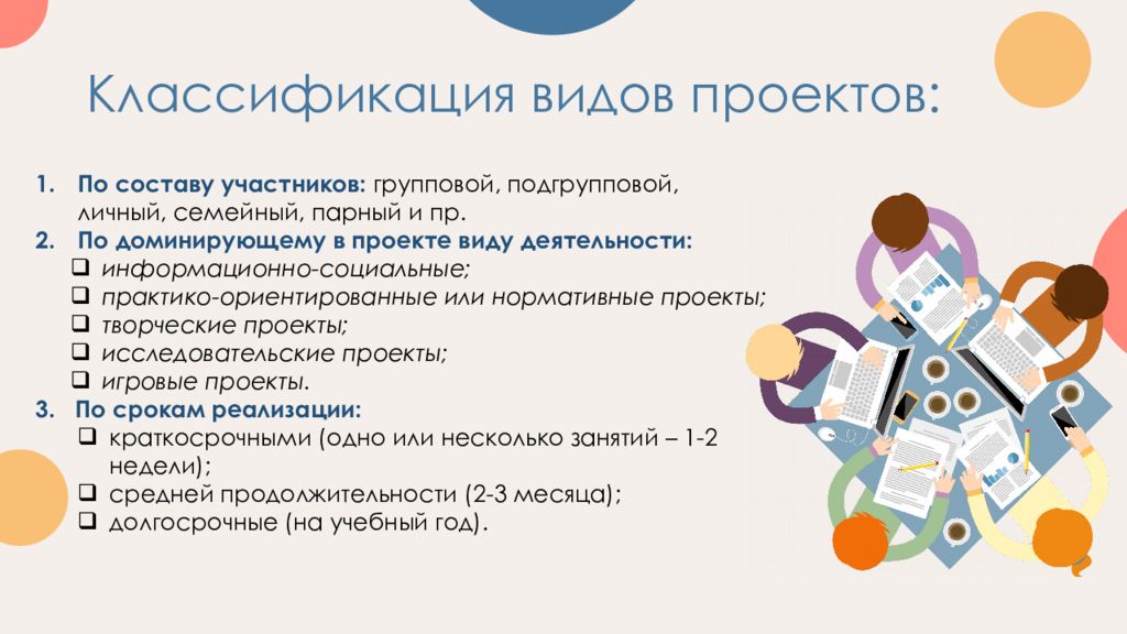 По составу участников: групповой, подгрупповой, личный, семейный, парный и пр. По доминирующему в проекте виду деятельности: информационно-социальные; практико-ориентированные или нормативные проекты; творческие проекты; исследовательские проекты; игровые проекты. 3. По срокам реализации: краткосрочными (одно или несколько занятий – 1-2 недели); средней продолжительности (2-3 месяца); долгосрочные (на учебный год).
