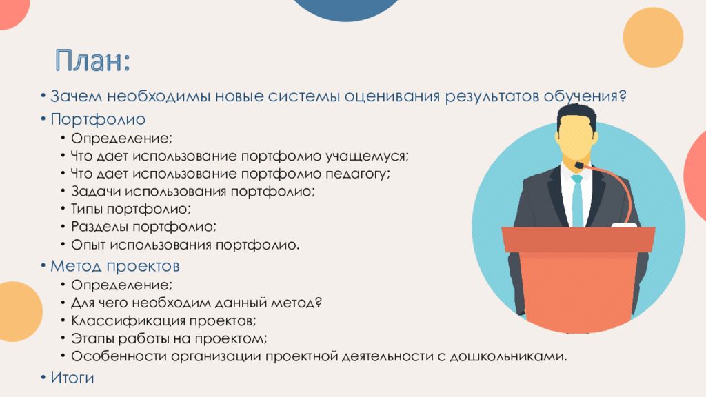 Зачем необходимы новые системы оценивания результатов обучения? Портфолио Определение; Что дает использование портфолио учащемуся; Что дает использование портфолио педагогу; Задачи использования портфолио; Типы портфолио; Разделы портфолио; Опыт использования портфолио. Метод проектов Определение; Для чего необходим данный метод? Классификация проектов; Этапы работы на проектом; Особенности организации проектной деятельности с дошкольниками. Итоги
