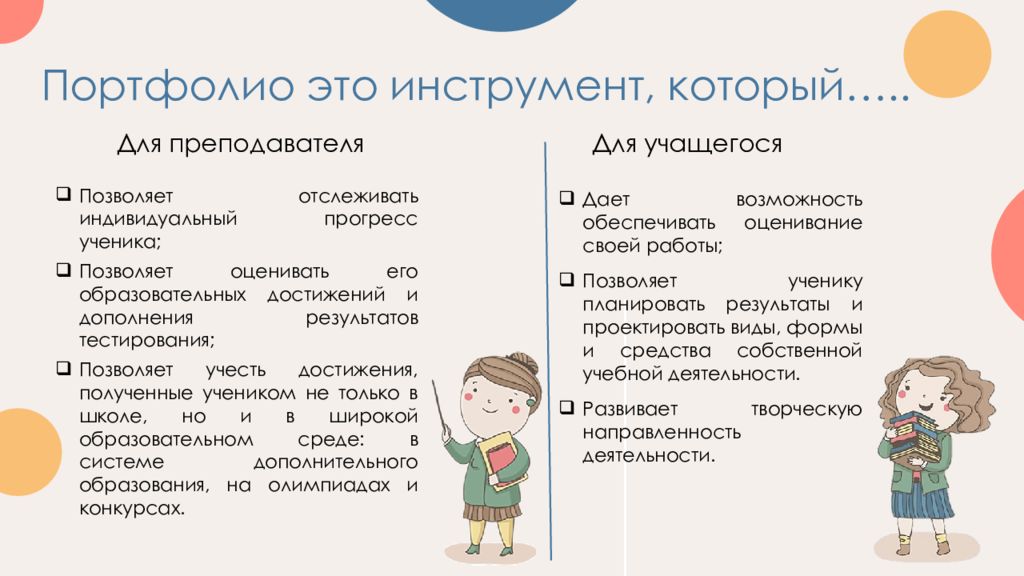 Для преподавателя Для учащегося Дает возможность обеспечивать оценивание своей работы; Позволяет ученику планировать результаты и проектировать виды, формы и средства собственной учебной деятельности. Развивает творческую направленность деятельности. Позволяет отслеживать индивидуальный прогресс ученика; Позволяет оценивать его образовательных достижений и дополнения результатов тестирования; Позволяет учесть достижения, полученные учеником не только в школе, но и в широкой образовательном среде: в системе дополнительного образования, на олимпиадах и конкурсах.