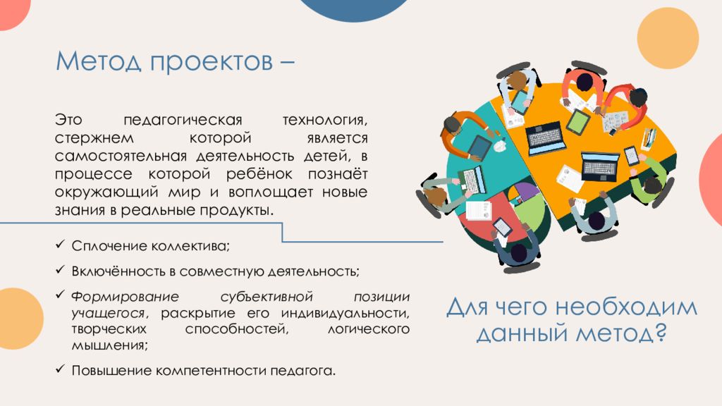 Это педагогическая технология, стержнем которой является самостоятельная деятельность детей, в процессе которой ребёнок познаёт окружающий мир и воплощает новые знания в реальные продукты. Сплочение коллектива; Включённость в совместную деятельность; Формирование субъективной позиции учащегося, раскрытие его индивидуальности, творческих способностей, логического мышления; Повышение компетентности педагога. Для чего необходим данный метод?