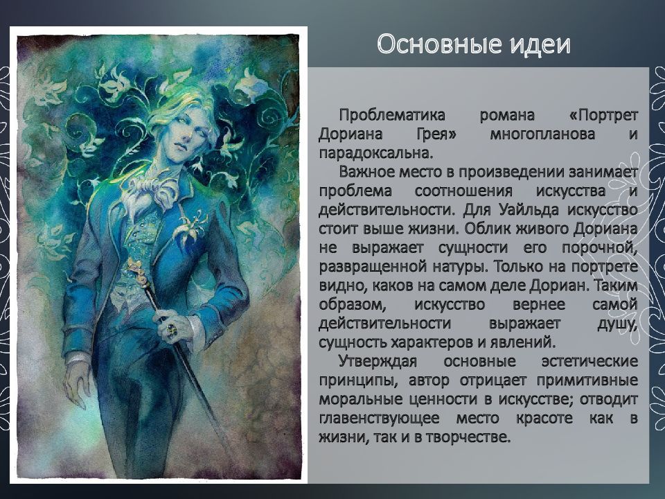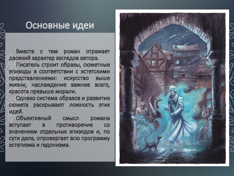Вместе с тем роман отражает двоякий характер взглядов автора. Писатель строит образы, сюжетные эпизоды в соответствии с эстетскими представлениями : искусство выше жизни, наслаждение важнее всего, красота превыше морали. Однако система образов и развитие сюжета раскрывают ложность этих идей. Объективный смысл романа вступает в противоречие со значением отдельных эпизодов и, по сути дела, опровергает всю программу эстетизма и гедонизма. Основные идеи