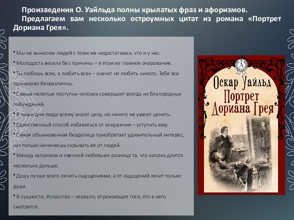 Произведения О. Уайльда полны крылатых фраз и афоризмов. Предлагаем вам несколько остроумных цитат из романа «Портрет Дориана Грея». Мы не выносим людей с теми же недостатками, что и у нас. Молодость весела без причины – в этом ее главное очарование. Ты любишь всех, а любить всех – значит не любить никого. Тебе все одинаково безразличны. Самые нелепые поступки человек совершает всегда из благородных побуждений. В наши дни люди всему знают цену, но ничего не умеют ценить. Единственный способ избавиться от искушения – уступить ему. Самая обыкновенная безделица приобретает удивительный интерес, как только начинаешь скрывать ее от людей. Между капризом и «вечной любовью» разница та, что каприз длится несколько дольше. Душу лучше всего лечить ощущениями, а от ощущений лечит только душа. В сущности, Искусство – зеркало, отражающее того, кто в него смотрится.