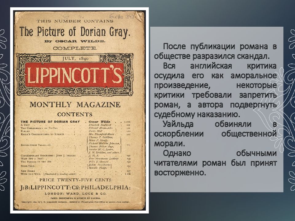 После публикации романа в обществе разразился скандал. Вся английская критика осудила его как аморальное произведение, некоторые критики требовали запретить роман, а автора подвергнуть судебному наказанию. Уайльда обвиняли в оскорблении общественной морали. Однако обычными читателями роман был принят восторженно.