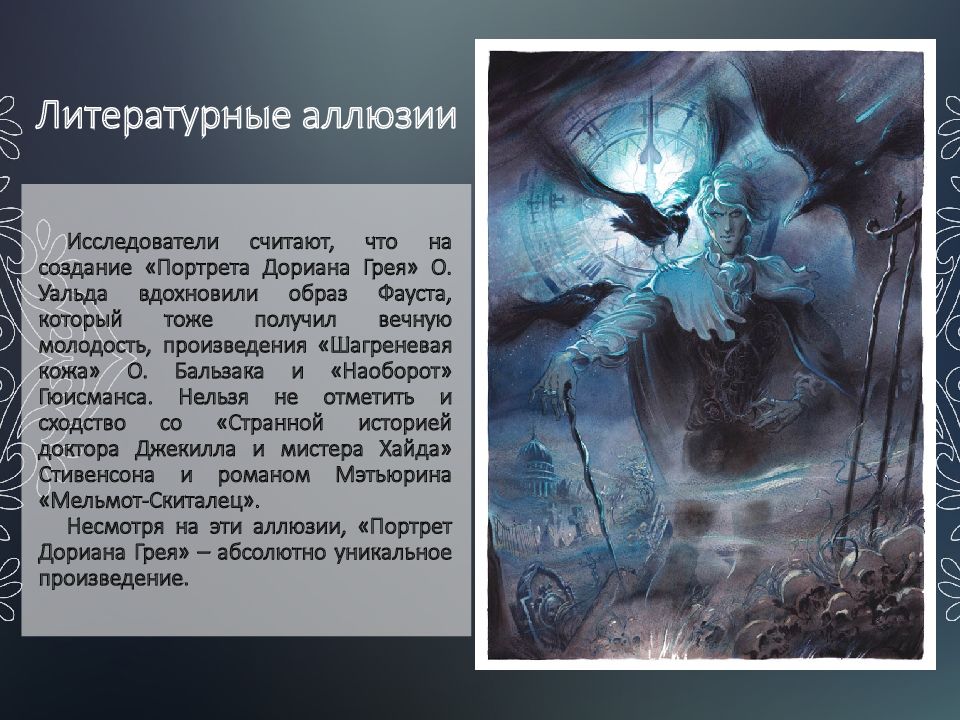 Исследователи считают, что на создание «Портрета Дориана Грея» О. Уальда вдохновили образ Фауста, который тоже получил вечную молодость, произведения «Шагреневая кожа» О. Бальзака и «Наоборот» Гюисманса. Нельзя не отметить и сходство со «Странной историей доктора Джекилла и мистера Хайда » Стивенсона и романом Мэтьюрина « Мельмот-Скиталец ». Несмотря на эти аллюзии, «Портрет Дориана Грея» – абсолютно уникальное произведение. Литературные аллюзии