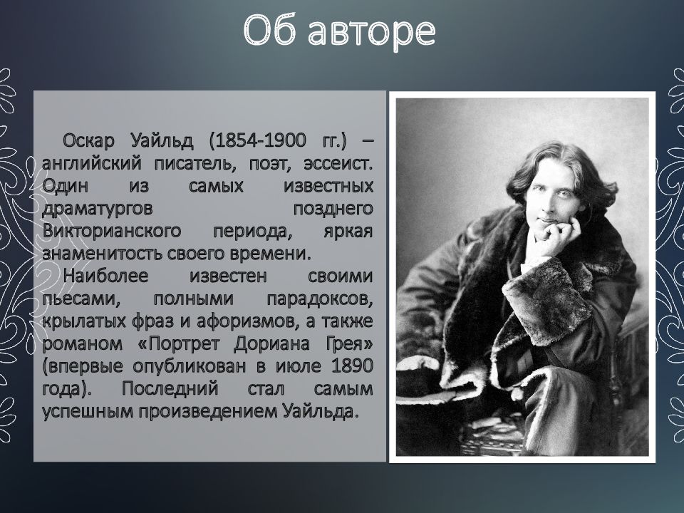 Оскар Уайльд (1854-1900 гг.) – английский писатель, поэт, эссеист. Один из самых известных драматургов позднего Викторианского периода, яркая знаменитость своего времени. Наиболее известен своими пьесами, полными парадоксов, крылатых фраз и афоризмов, а также романом «Портрет Дориана Грея» (впервые опубликован в июле 1890 года). Последний стал самым успешным произведением Уайльда.
