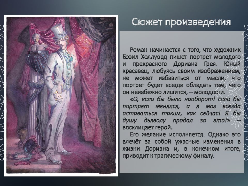 Роман начинается с того, что художник Бэзил Холлуорд пишет портрет молодого и прекрасного Дориана Грея. Юный красавец, любуясь своим изображением, не может избавиться от мысли, что портрет будет всегда обладать тем, чего он неизбежно лишится, – молодости. « О, если бы было наоборот! Если бы портрет менялся, а я мог всегда оставаться таким, как сейчас! Я бы душу дьяволу продал за это! » – восклицает герой. Его желание исполняется. Однако это влечёт за собой ужасные изменения в жизни Дориана и, в конечном итоге, приводит к трагическому финалу.