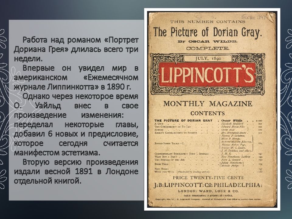 Работа над романом «Портрет Дориана Грея» длилась всего три недели. Впервые он увидел мир в американском « Ежемесячном журнале Липпинкотта » в 1890 г. Однако через некоторое время О. Уайльд внес в свое произведение изменения : переделал некоторые главы, добавил 6 новых и предисловие, которое сегодня считается манифестом эстетизма. Вторую версию произведения издали весной 1891 в Лондоне отдельной книгой.