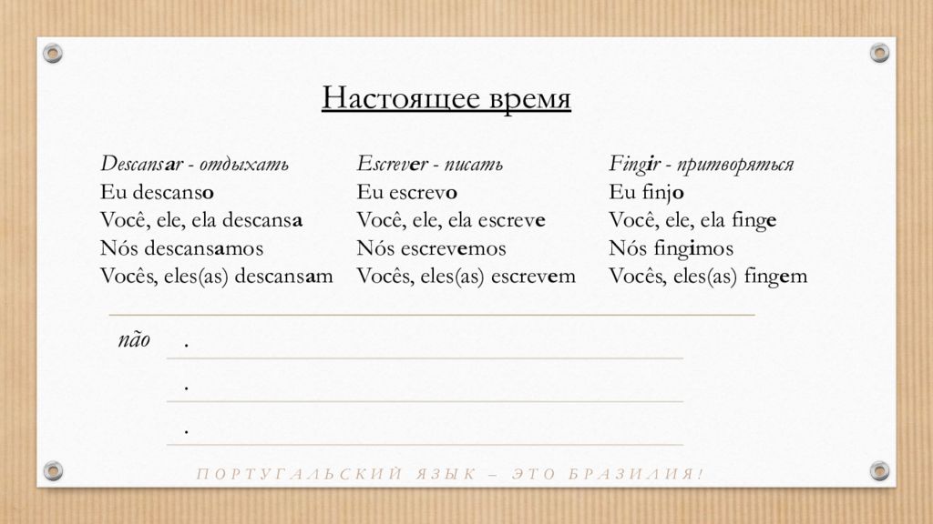Настоящее время Descans a r - отдыхать Eu descans o Você, ele, ela descans a Nós descans a mos Vocês, eles(as) descans a m Escrev e r - писать Eu escrev o Você, ele, ela escrev e Nós escrev e mos Vocês, eles(as) escrev e m Fing i r - притворяться Eu finj o Você, ele, ela fing e Nós fing i mos Vocês, eles(as) fing e m ПОРТУГАЛЬСКИЙ ЯЗЫК – ЭТО БРАЗИЛИЯ!