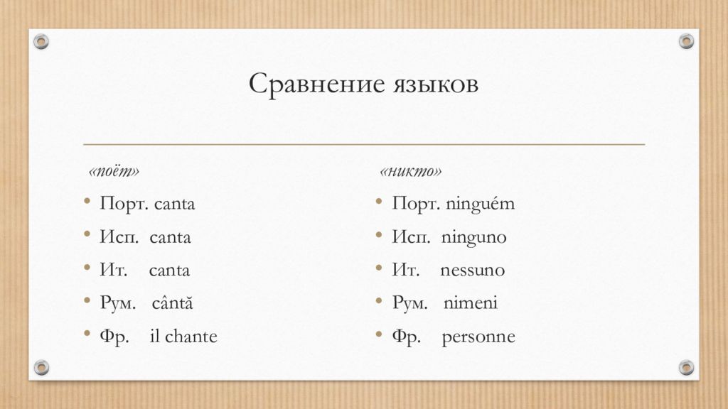 «поёт» Порт. canta Исп. canta Ит. canta Рум. cântă Фр. il chante «никто» Порт. ninguém Исп. n inguno Ит. nessuno Рум. nimeni Фр. personne