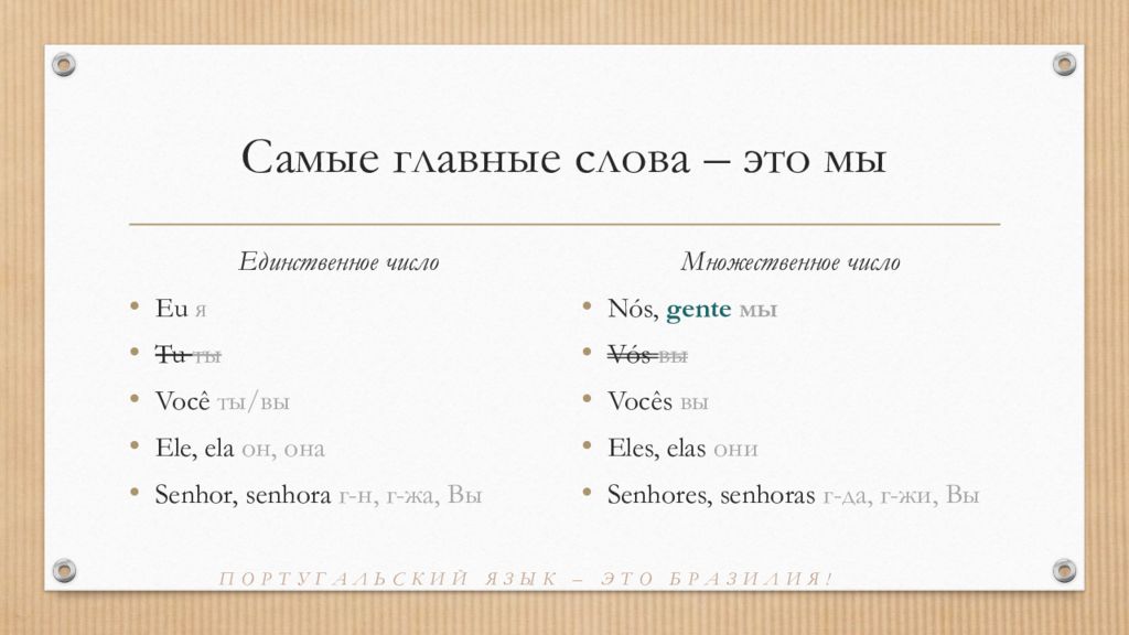 Единственное число Eu я Tu ты Você ты/вы Ele, ela он, она Senhor, senhora г-н, г-жа, Вы Множественное число Nós, gente мы Vós вы Vocês вы Eles, elas они Senhores, senhoras г-да, г-жи, Вы ПОРТУГАЛЬСКИЙ ЯЗЫК – ЭТО БРАЗИЛИЯ!