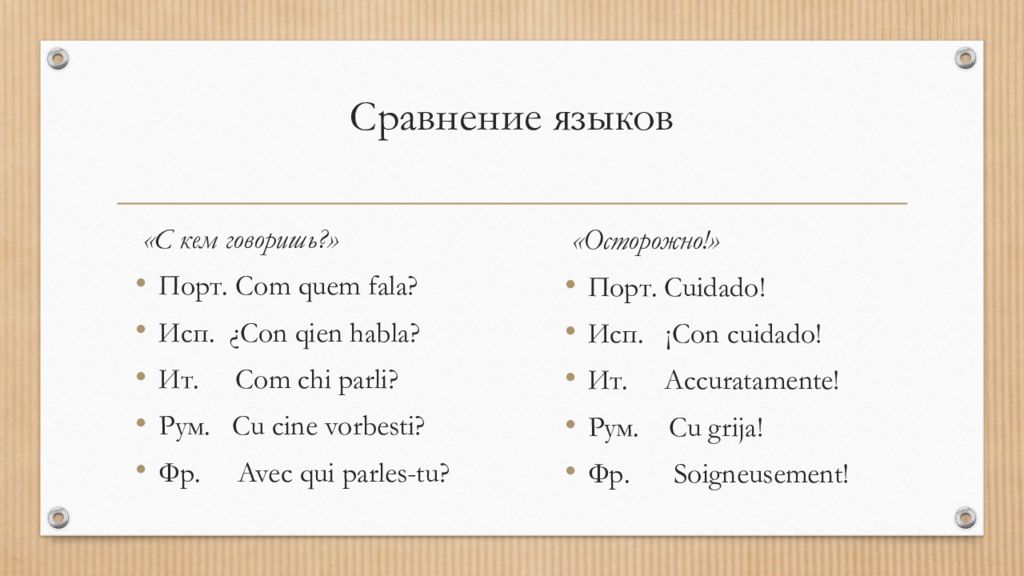 «С кем говоришь?» Порт. Com quem fala ? Исп. ¿Con qien habla ? Ит. Com chi parli ? Рум. Cu cine vorbesti? Фр. Avec qui parles-tu ? «Осторожно!» Порт. Cuidado! Исп. ¡ Con cuidado ! Ит. Accuratamente! Рум. Cu grija ! Фр. Soigneusement !