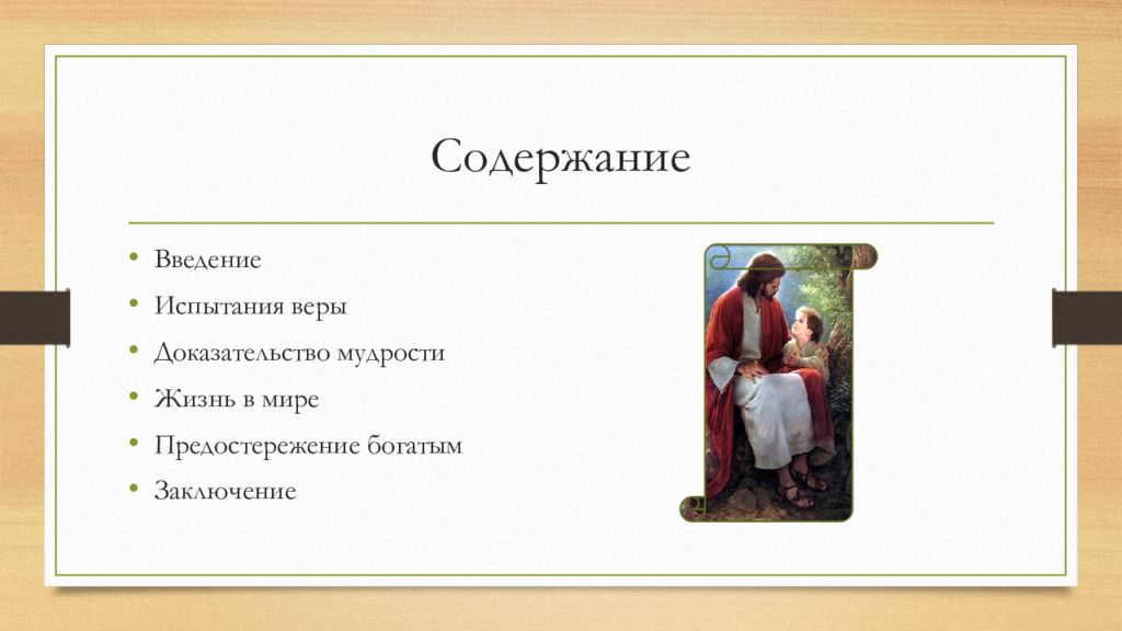 Введение Испытания веры Доказательство мудрости Жизнь в мире Предостережение богатым Заключение