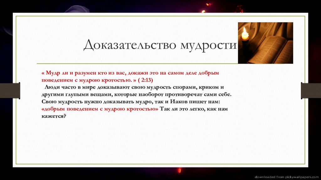 « Мудр ли и разумен кто из вас, докажи это на самом деле добрым поведением с мудрою кротостью. » ( 2:13) Люди часто в мире доказывают свою мудрость спорами, криком и другими глупыми вещами, которые наоборот противоречат сами себе. Свою мудрость нужно доказывать мудро, так и Иаков пишет нам: «добрым поведением с мудрою кротостью» Так ли это легко, как нам кажется?