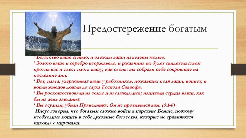 2 Богатство ваше сгнило, и одежды ваши изъедены молью. 3 Золото ваше и серебро изоржавело, и ржавчина их будет свидетельством против вас и съест плоть вашу, как огонь: вы собрали себе сокровище на последние дни. 4 Вот, плата, удержанная вами у работников, пожавших поля ваши, вопиет, и вопли жнецов дошли до слуха Господа Саваофа. 5 Вы роскошествовали на земле и наслаждались; напитали сердца ваши, как бы на день заклания. 6 Вы осудили, убили Праведника; Он не противился вам. (5:1-6) Иисус говорил, что богатым сложно войти в царствие Божие, поэтому необходимо копить в себе духовные богатства, которые не сравняются никогда с мирскими.