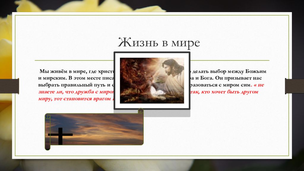 Мы живём в мире, где христианину постоянно необходимо делать выбор между Божьим и мирским. В этом месте писания говориться о вражде мира и Бога. Он призывает нас выбрать правильный путь и стать на сторону Бога, не сообразоваться с миром сим. « не знаете ли, что дружба с миром есть вражда против Бога? Итак, кто хочет быть другом миру, тот становится врагом Богу. » ( 4:4)