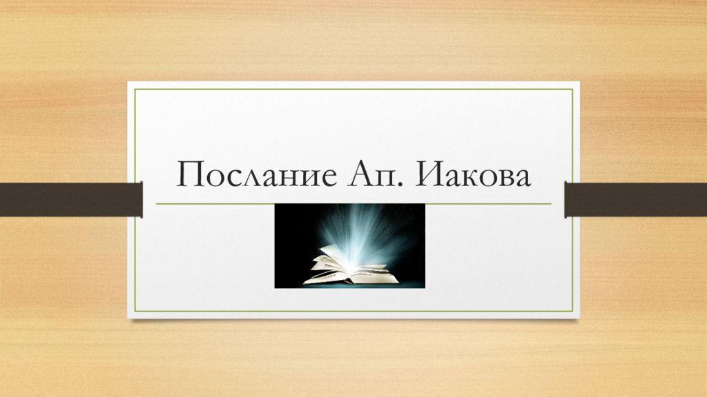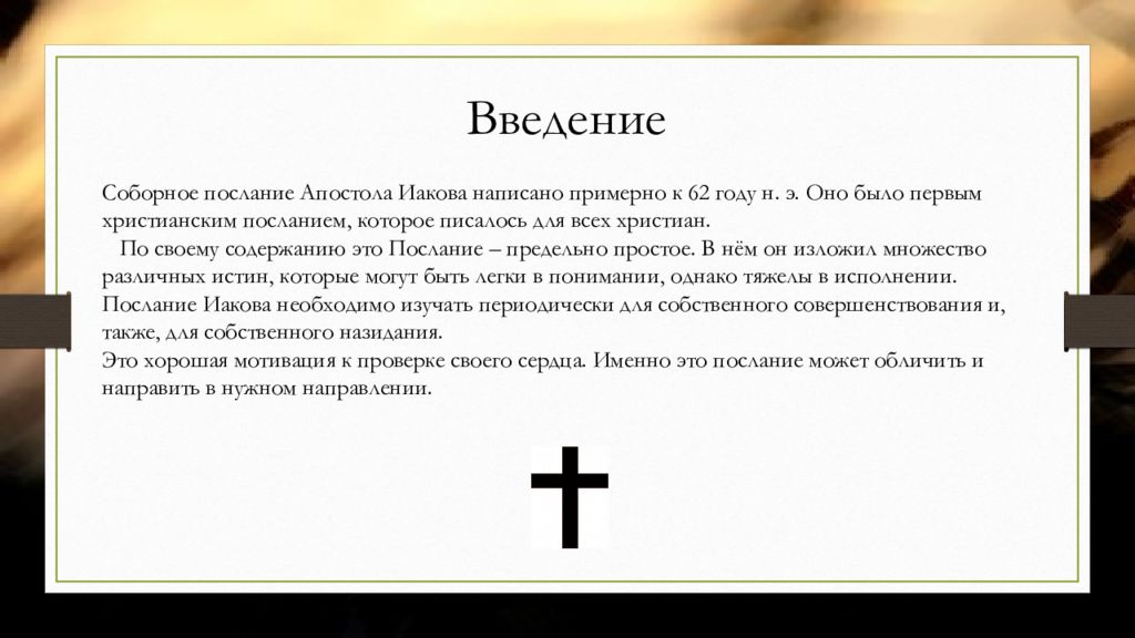 Введение Соборное послание Апостола Иакова написано примерно к 62 году н. э. Оно было первым христианским посланием, которое писалось для всех христиан. По своему содержанию это Послание – предельно простое. В нём он изложил множество различных истин, которые могут быть легки в понимании, однако тяжелы в исполнении. Послание Иакова необходимо изучать периодически для собственного совершенствования и, также, для собственного назидания. Это хорошая мотивация к проверке своего сердца. Именно это послание может обличить и направить в нужном направлении.