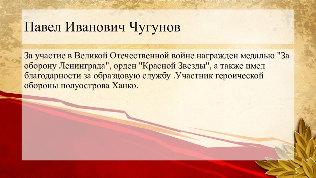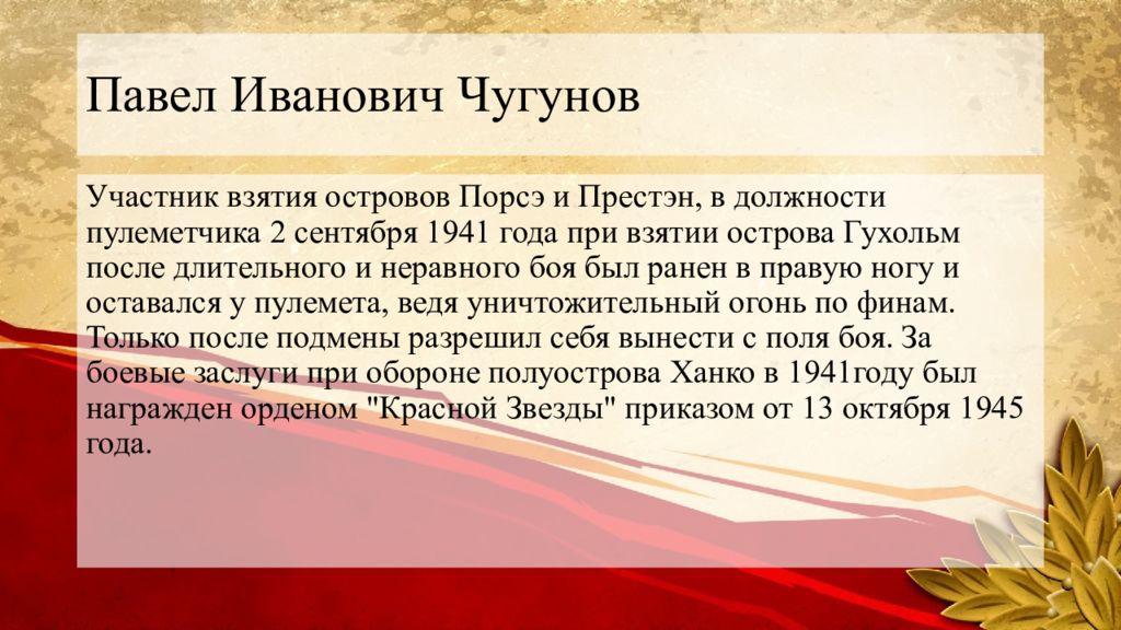 Участник взятия островов Порсэ и Престэн, в должности пулеметчика 2 сентября 1941 года при взятии острова Гухольм после длительного и неравного боя был ранен в правую ногу и оставался у пулемета, ведя уничтожительный огонь по финам. Только после подмены разрешил себя вынести с поля боя. За боевые заслуги при обороне полуострова Ханко в 1941году был награжден орденом "Красной Звезды" приказом от 13 октября 1945 года.