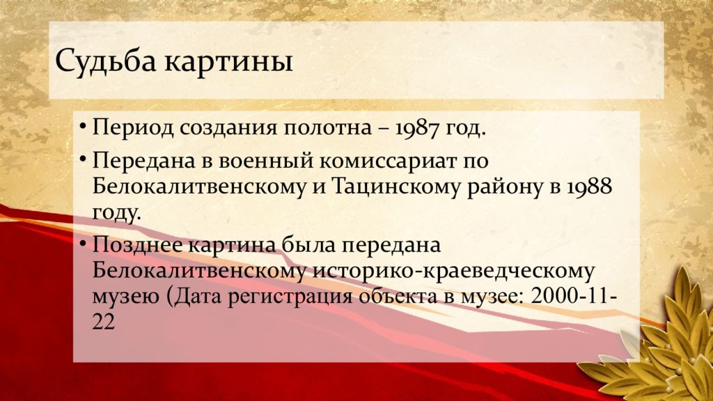 Период создания полотна – 1987 год. Передана в военный комиссариат по Белокалитвенскому и Тацинскому району в 1988 году. Позднее картина была передана Белокалитвенскому историко-краеведческому музею ( Дата регистрация объекта в музее: 2000-11-22