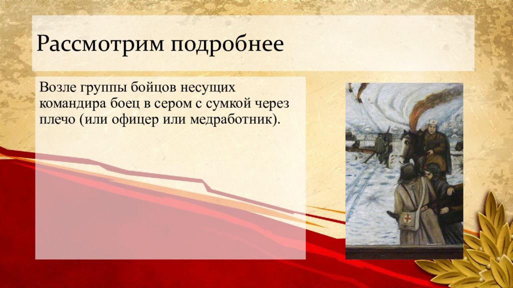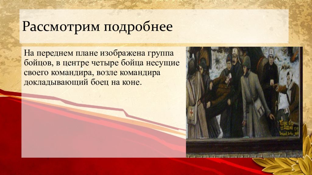 На переднем плане изображена группа бойцов, в центре четыре бойца несущие своего командира, возле командира докладывающий боец на коне.