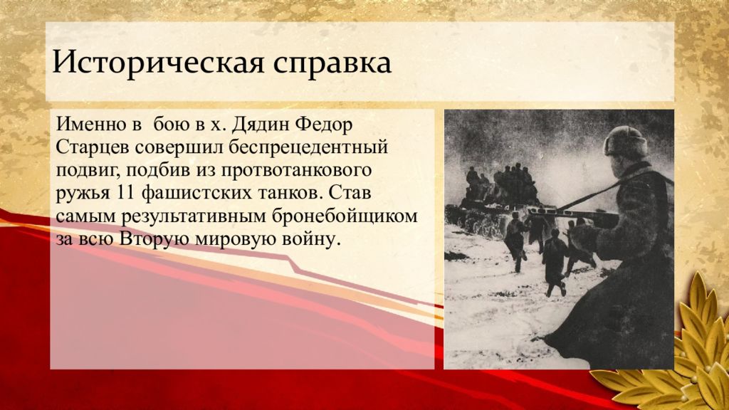 Именно в бою в х. Дядин Федор Старцев совершил беспрецедентный подвиг, подбив из протвотанкового ружья 11 фашистских танков. Став самым результативным бронебойщиком за всю Вторую мировую войну.