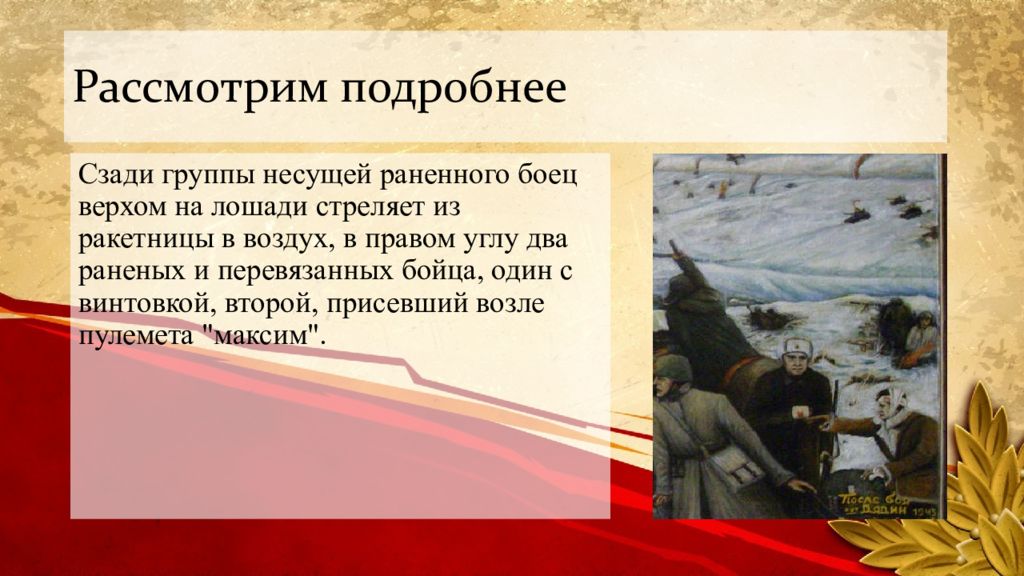 Сзади группы несущей раненного боец верхом на лошади стреляет из ракетницы в воздух, в правом углу два раненых и перевязанных бойца, один с винтовкой, второй, присевший возле пулемета "максим".