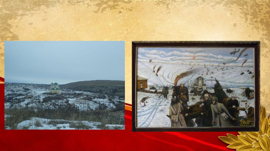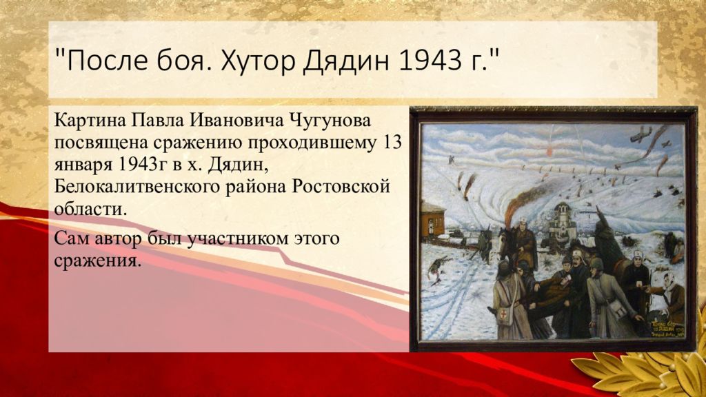 Картина Павла Ивановича Чугунова посвящена сражению проходившему 13 января 1943г в х. Дядин, Белокалитвенского района Ростовской области. Сам автор был участником этого сражения.