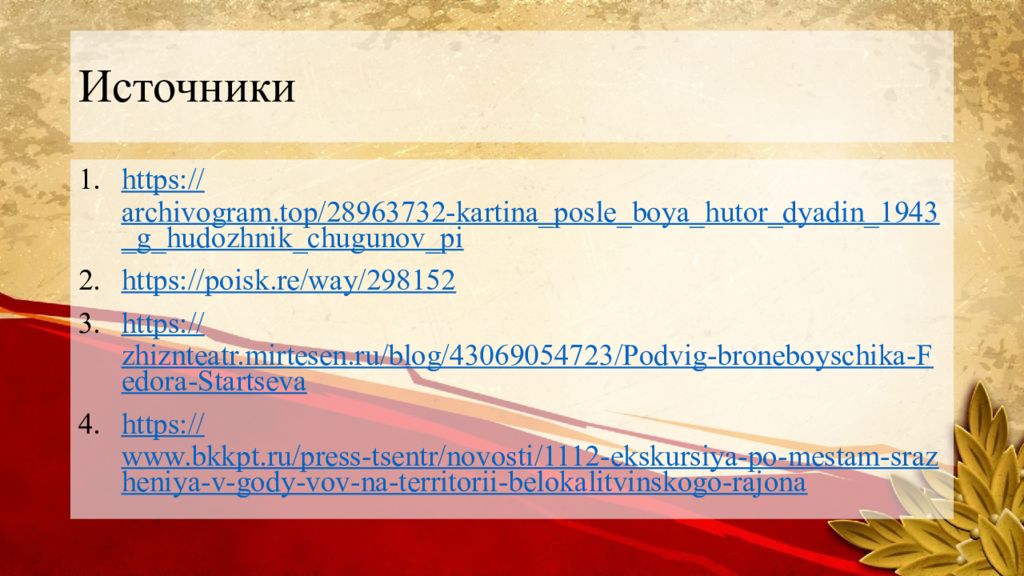 https :// archivogram.top/28963732-kartina_posle_boya_hutor_dyadin_1943_g_hudozhnik_chugunov_pi https:// poisk.re/way/298152 https:// zhiznteatr.mirtesen.ru/blog/43069054723/Podvig-broneboyschika-Fedora-Startseva https:// www.bkkpt.ru/press-tsentr/novosti/1112-ekskursiya-po-mestam-srazheniya-v-gody-vov-na-territorii-belokalitvinskogo-rajona
