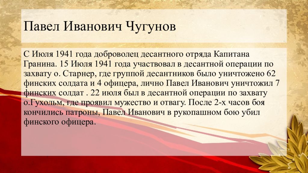 С Июля 1941 года доброволец десантного отряда Капитана Гранина. 15 Июля 1941 года участвовал в десантной операции по захвату о. Старнер, где группой десантников было уничтожено 62 финских солдата и 4 офицера, лично Павел Иванович уничтожил 7 финских солдат. 22 июля был в десантной операции по захвату о.Гухольм, где проявил мужество и отвагу. После 2-х часов боя кончились патроны, Павел Иванович в рукопашном бою убил финского офицера.