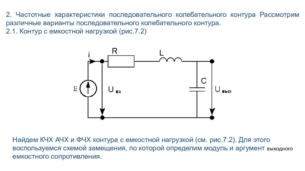 2. Частотные характеристики последовательного колебательного контура Рассмотрим различные варианты последовательного колебательного контура. 2.1. Контур с емкостной нагрузкой (рис.7.2) Найдем КЧХ АЧХ и ФЧХ контура с емкостной нагрузкой (см. рис.7.2). Для этого воспользуемся схемой замещения, по которой определим модуль и аргумент выходного емкостного сопротивления.