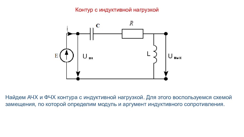Контур с индуктивной нагрузкой Найдем АЧХ и ФЧХ контура с индуктивной нагрузкой. Для этого воспользуемся схемой замещения, по которой определим модуль и аргумент индуктивного сопротивления.