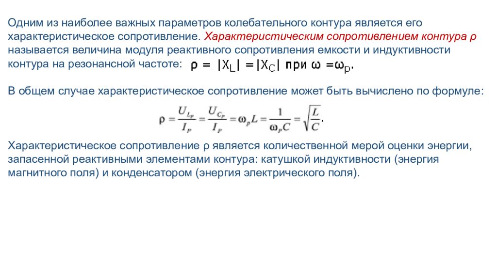 Одним из наиболее важных параметров колебательного контура является его характеристическое сопротивление. Характеристическим сопротивлением контура ρ называется величина модуля реактивного сопротивления емкости и индуктивности контура на резонансной частоте: В общем случае характеристическое сопротивление может быть вычислено по формуле: Характеристическое сопротивление ρ является количественной мерой оценки энергии, запасенной реактивными элементами контура: катушкой индуктивности (энергия магнитного поля) и конденсатором (энергия электрического поля).