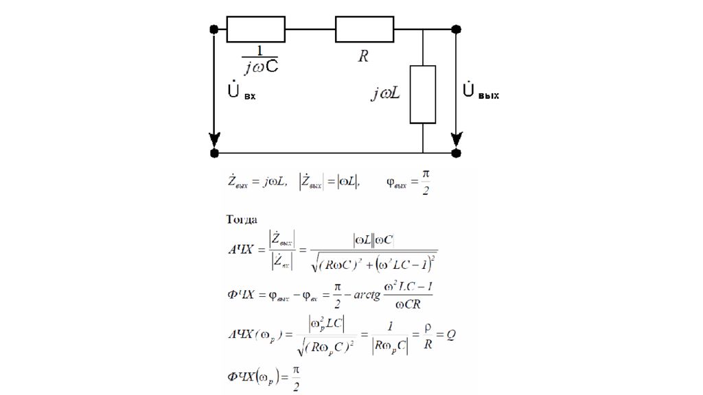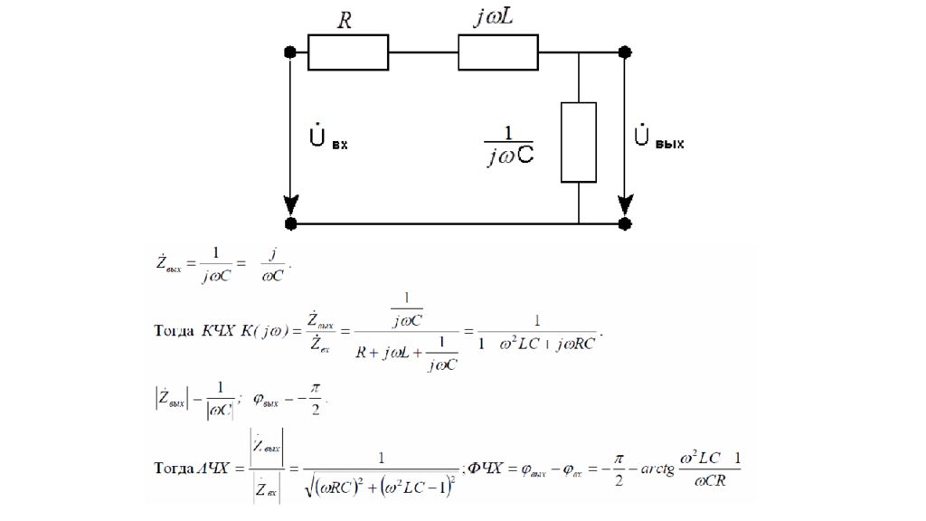 Последовательный колебательный контур На рисунке приведена схема последовательного колебательного контура с емкостной нагрузкой. Найдём КЧХ, АЧХ, ФЧХ этого четырёхполюсника при различных нагрузках. По определению КЧХ – отношение комплексных амплитуд выходного и входного гармонического сигнала в зависимости от его частоты.