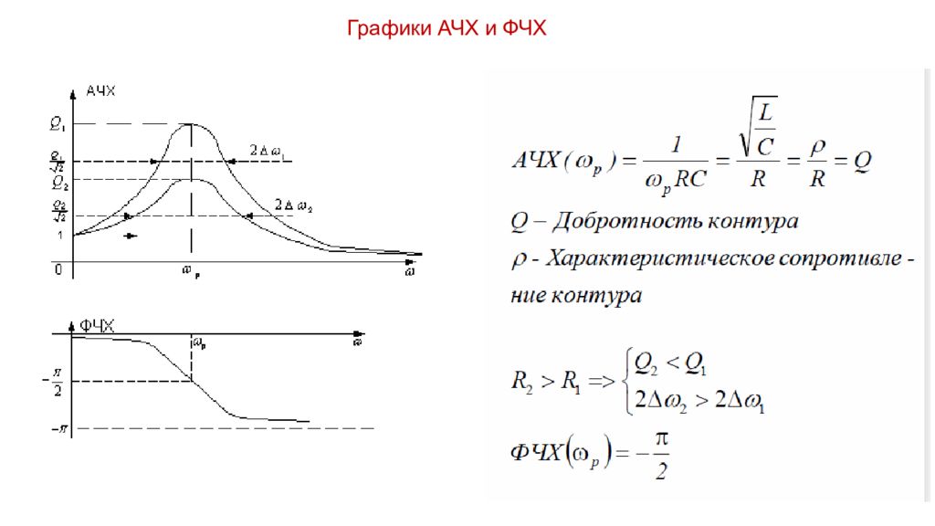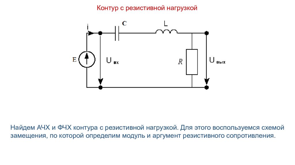 Контур с резистивной нагрузкой Найдем АЧХ и ФЧХ контура с резистивной нагрузкой. Для этого воспользуемся схемой замещения, по которой определим модуль и аргумент резистивного сопротивления.