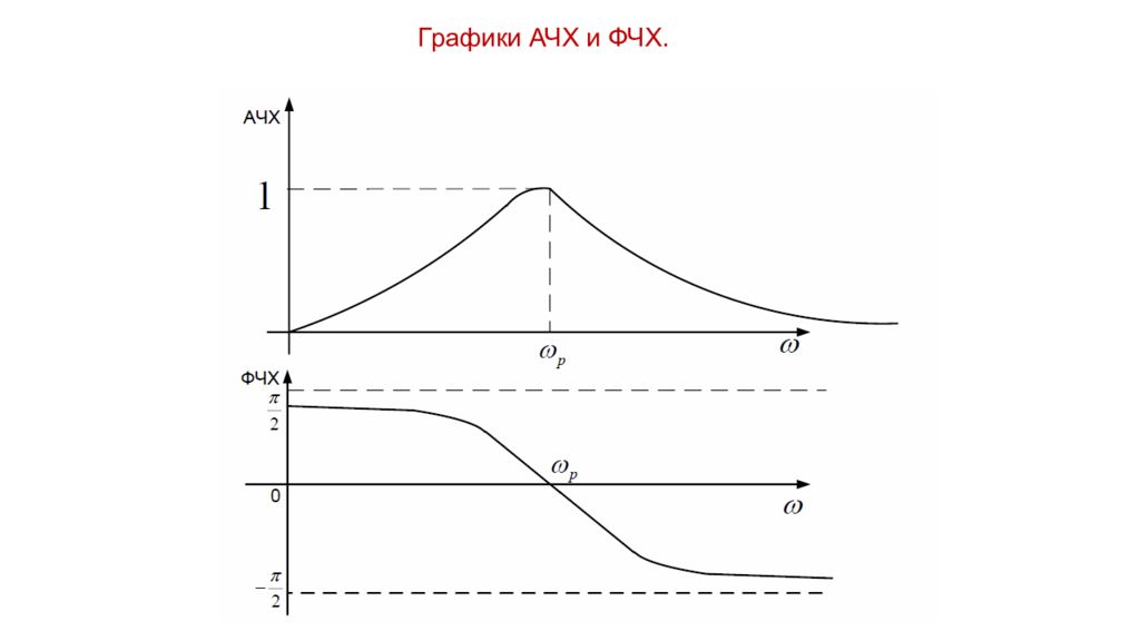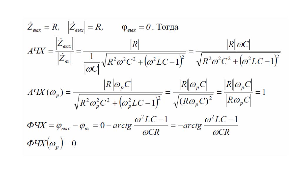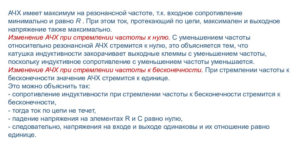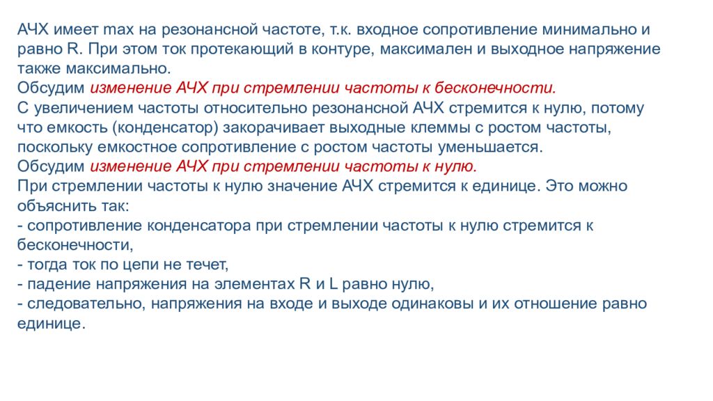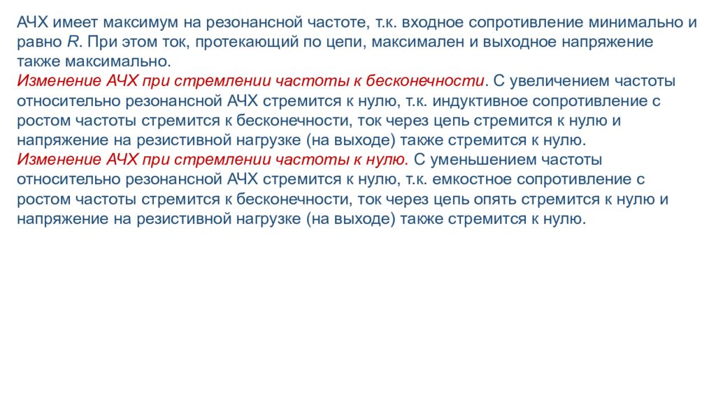 АЧХ имеет максимум на резонансной частоте, т.к. входное сопротивление минимально и равно R. При этом ток, протекающий по цепи, максимален и выходное напряжение также максимально. Изменение АЧХ при стремлении частоты к бесконечности. С увеличением частоты относительно резонансной АЧХ стремится к нулю, т.к. индуктивное сопротивление с ростом частоты стремится к бесконечности, ток через цепь стремится к нулю и напряжение на резистивной нагрузке (на выходе) также стремится к нулю. Изменение АЧХ при стремлении частоты к нулю. С уменьшением частоты относительно резонансной АЧХ стремится к нулю, т.к. емкостное сопротивление с ростом частоты стремится к бесконечности, ток через цепь опять стремится к нулю и напряжение на резистивной нагрузке (на выходе) также стремится к нулю.